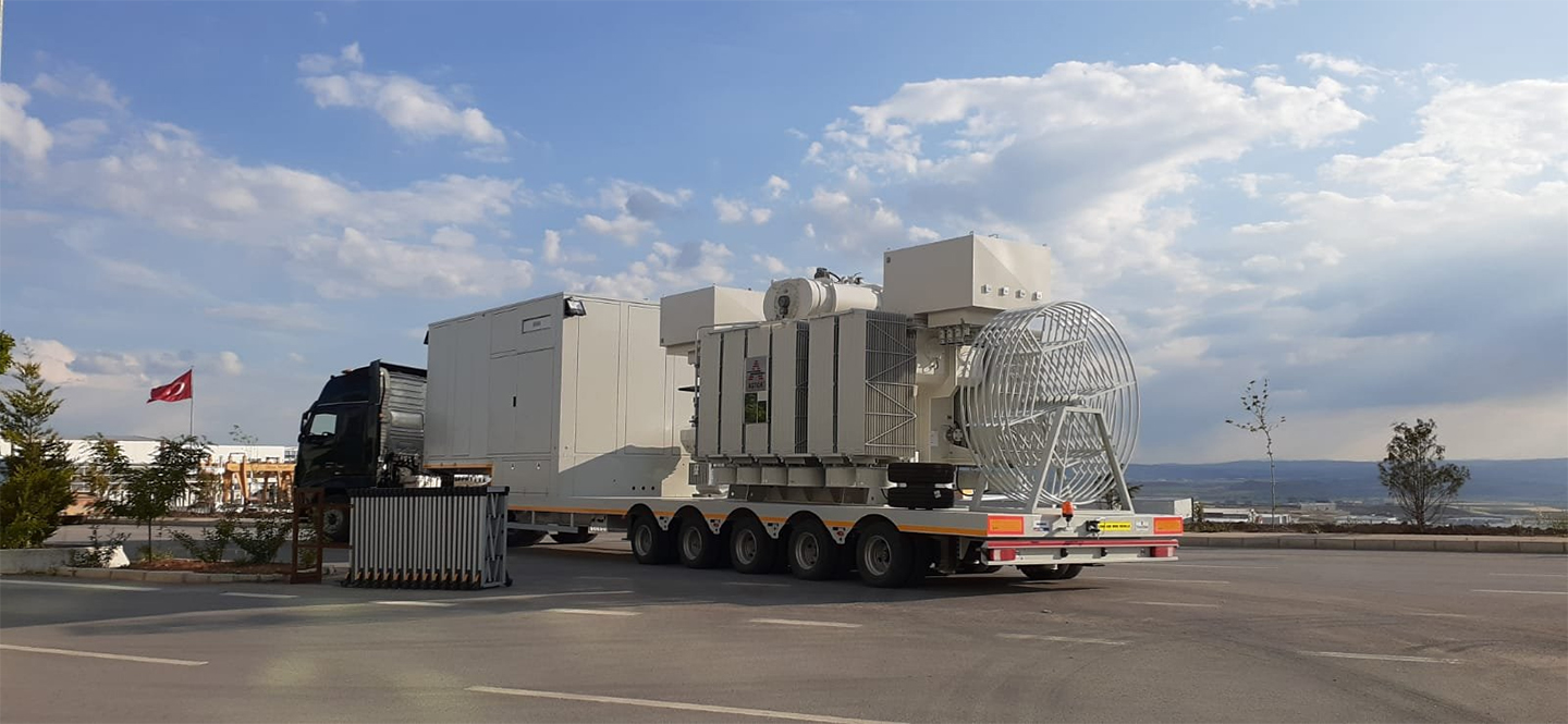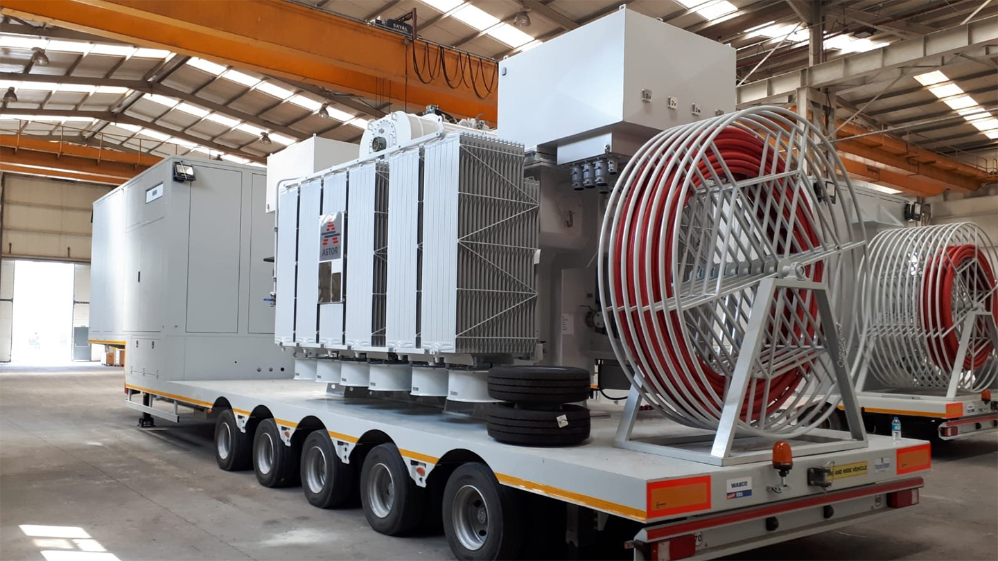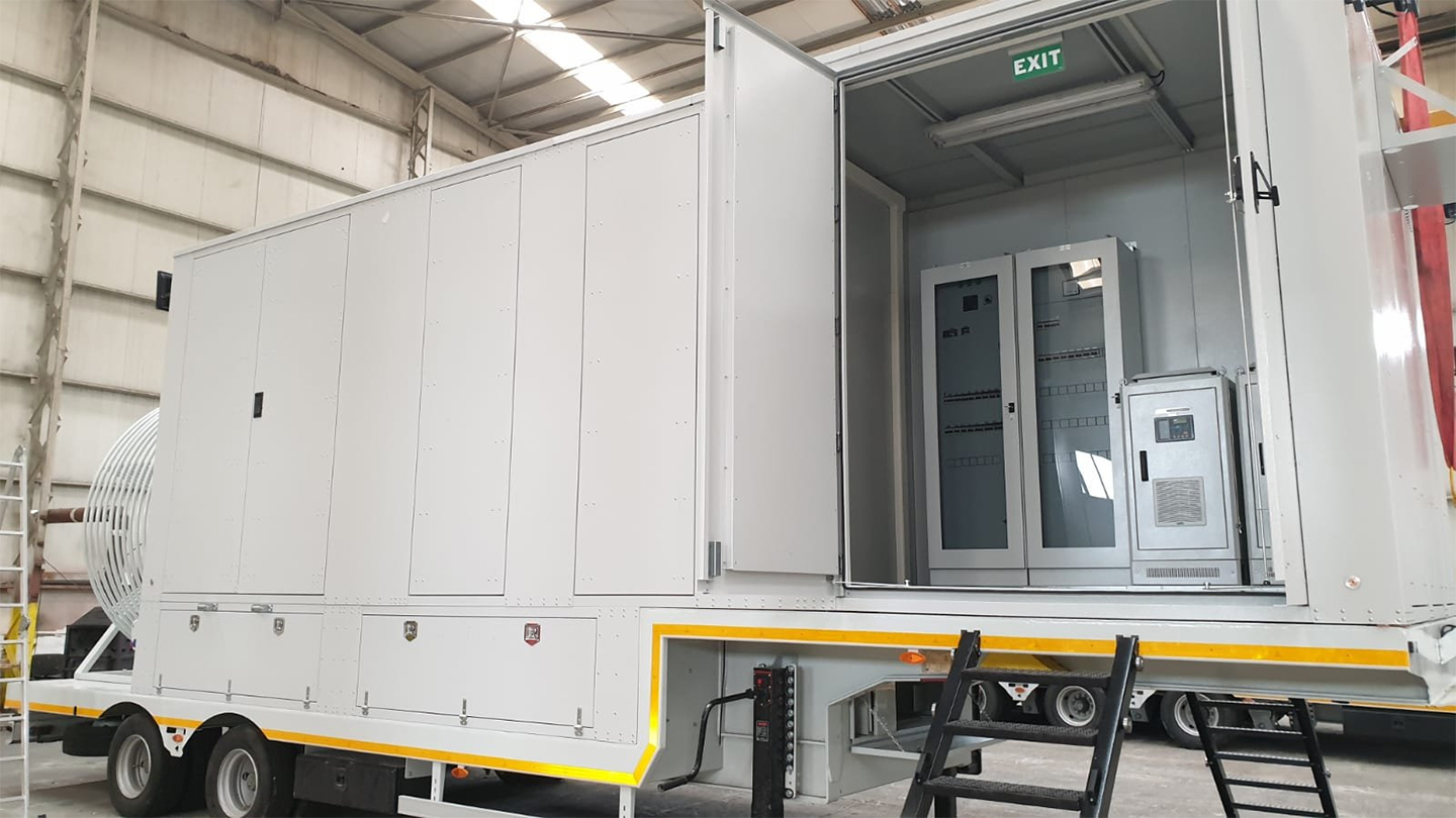 - Trailer 2: Including 11kV Switchgear, Battery & Charger, AC-DC Panels within E-House and cable drum mounted on the Transformer